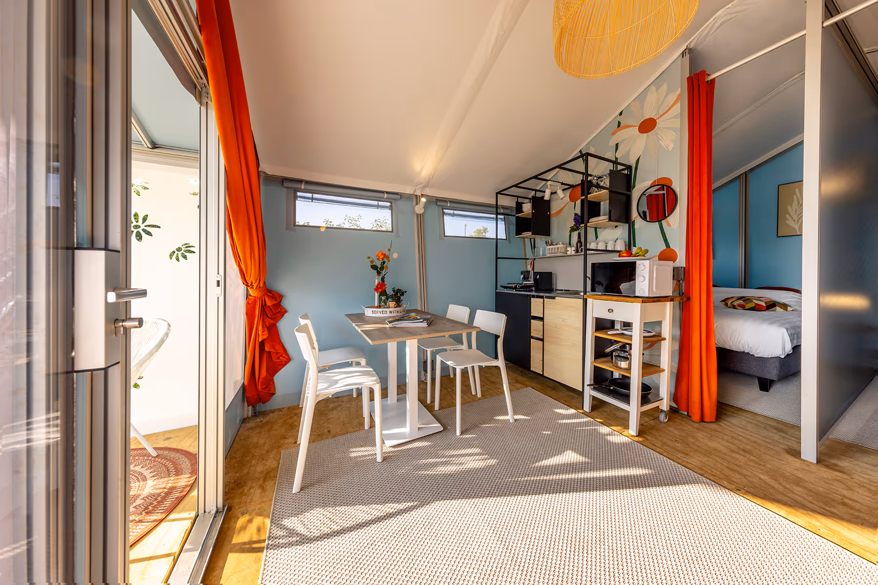 Nordya® is een diamantvormige glampingtent met een unieke, kleurrijke uitstraling. De volledig transparante voorgevel en glazen schuifpui creëren zelfs binnen een buitengevoel.